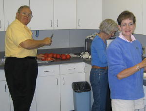 number of volunteers pitched in to prepare the salads, slice the tomatoes, onions and cucumbers, arrange the tables. Harold Bost, present to give us an update on the Bonanza museum and watch our departure, was a tireless worker in the kitchen.